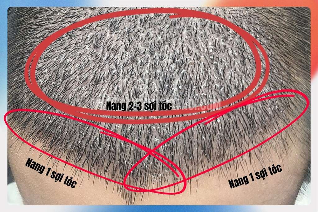 - Mỗi đơn vị nang tóc (cụm nang tóc): Chứa từ 1 đến 4 sợi tóc. Điều này có nghĩa là số lượng sợi tóc riêng lẻ thực tế có thể cao hơn nhiều so với số lượng trong một đơn vị nang tóc (cụm nang tóc).
