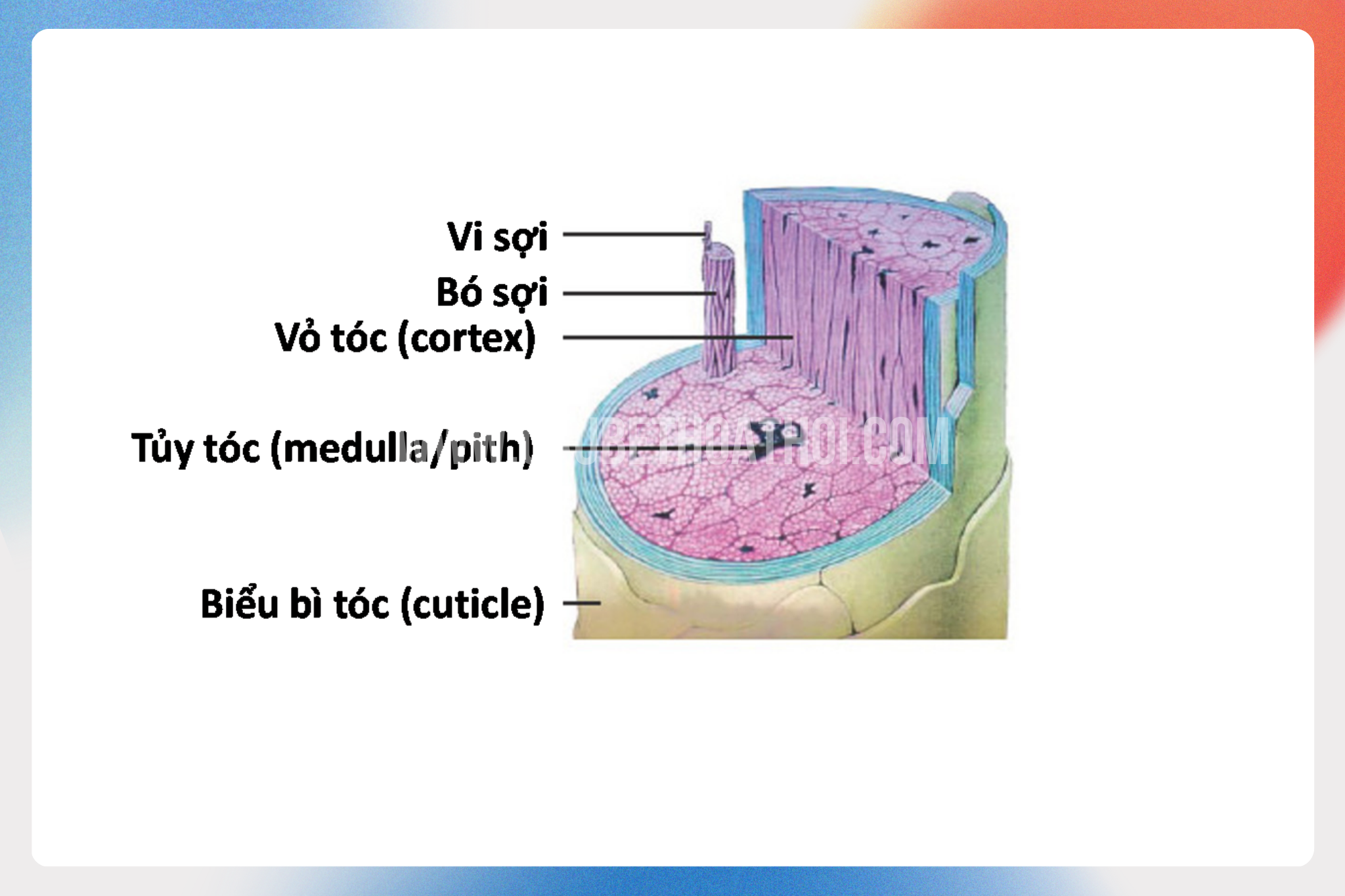 Thân tóc có thành phần chủ yếu là một loại protein giống như trong móng tay móng chân, gọi là keratin, chiếm 70%. Còn lại là một tỷ lệ nhỏ nước cùng một số chất béo, chất dầu có tác dụng gắn kết các phần keratin lại với nhau. Nó bao gồm ba lớp: lớp tủy ở giữa, lớp vỏ tạo cho tóc độ chắc và đàn hồi, và lớp biểu bì, lớp bảo vệ bên ngoài.