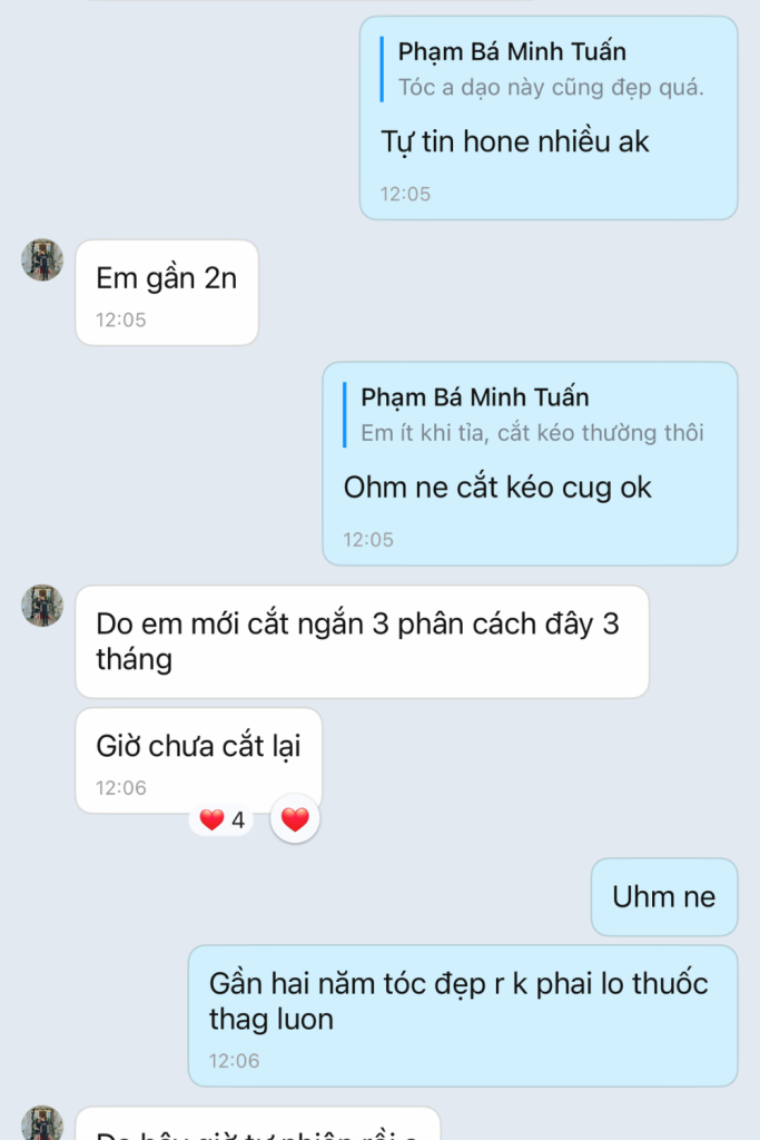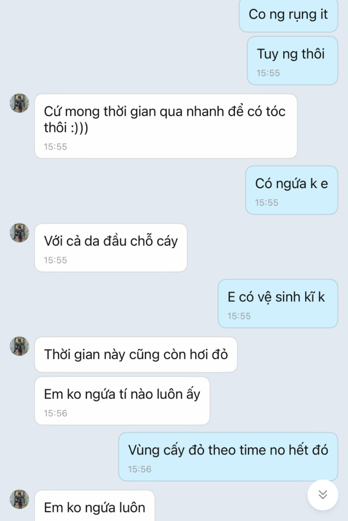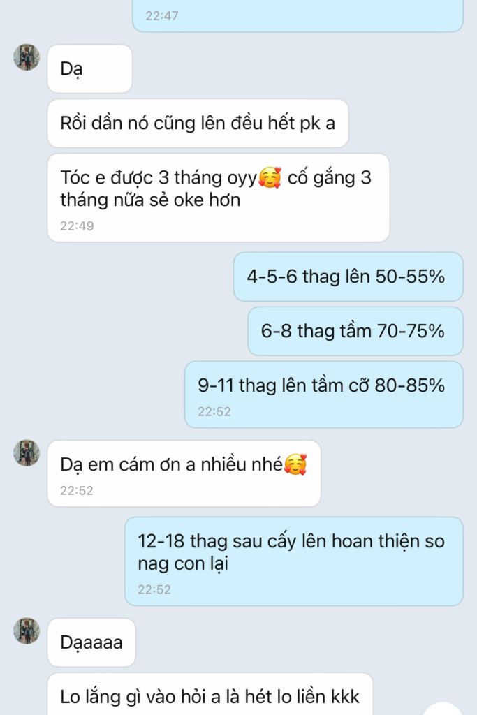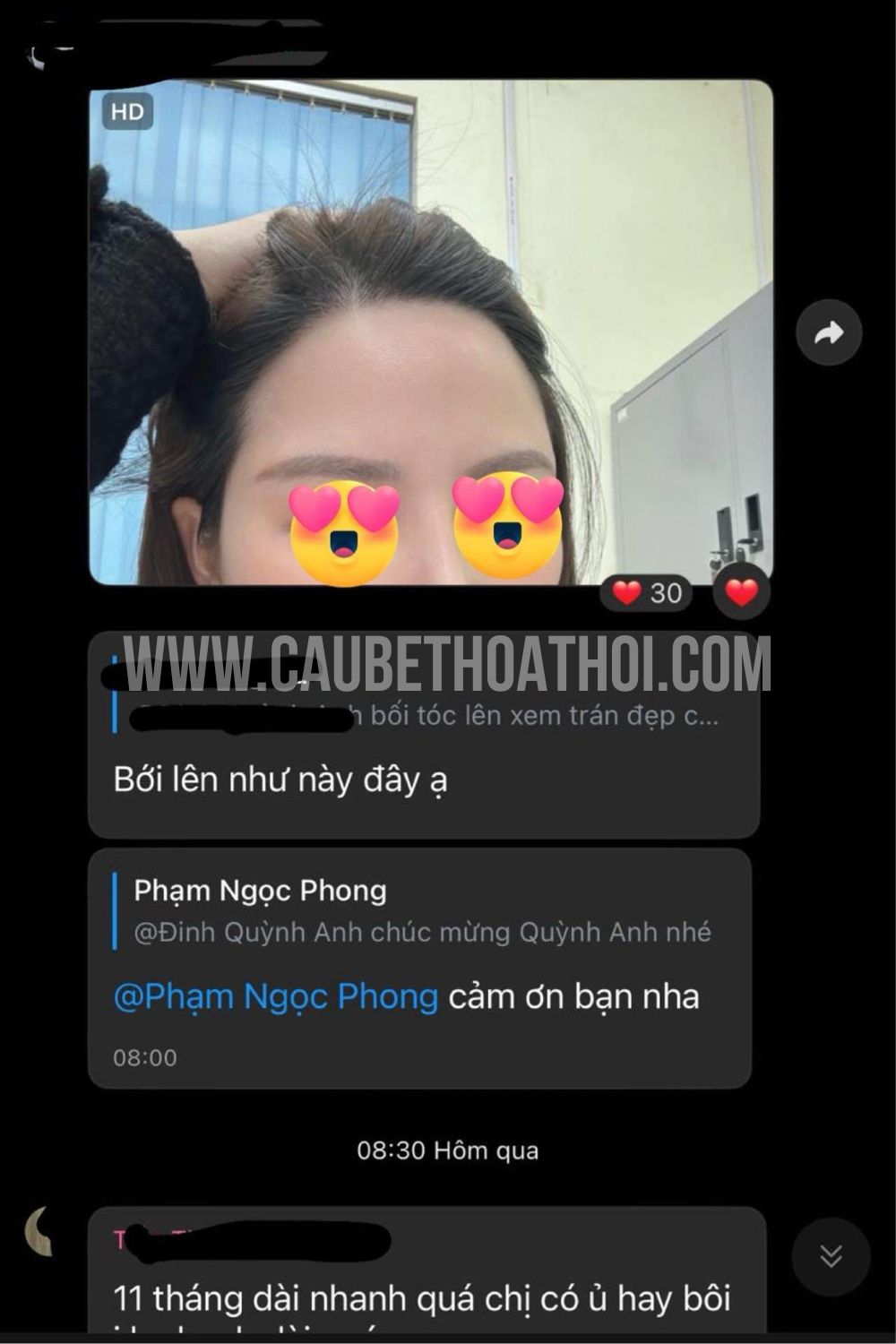 N.H.T ở Hà Nội chia sẻ: “May ngày đó biết anh rồi nhắn tin hỏi và được anh chia sẻ tất cả nên đi làm chỗ uy tín, giờ tóc 1 năm hơn đẹp rồi anh ơi..”