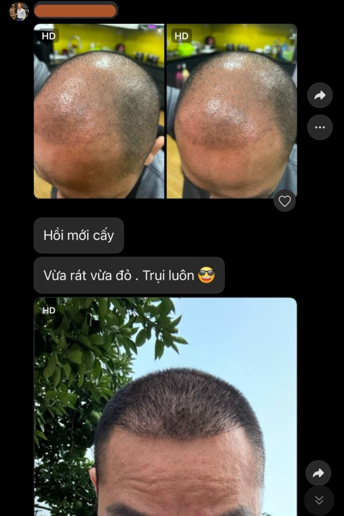H.A.Đ ở Hà Nội chia sẻ: “Biết bro qua hành trình cấy tóc thành công và giờ tự tin đi cấy 3000 nang chữa hói, chữa cấy hỏng lần 1 và kết quả thành công. Mình thích mật độ 40 nang/cm2 này vậy là ổn vì dày quá lại nóng..Cũng vì cấy lần 1 nên mình biết tóc cấy sẽ duy trì lâu dài.”