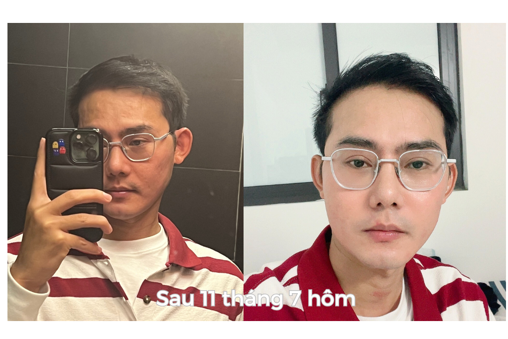 11 tháng 7-13 hôm sau cấy tóc, tóc mình thấy rõ sự hoàn thiện của nó, nhanh dài, sợi tóc chắc khoẻ, cắt chải cũng rất thoải mái. Mình đi chơi chỉ cần vuốt chút sáp lên là vô nếp, tuy ít tóc nhưng lại làm mình thấy tự tin rất nhiều so với lúc bị hói.